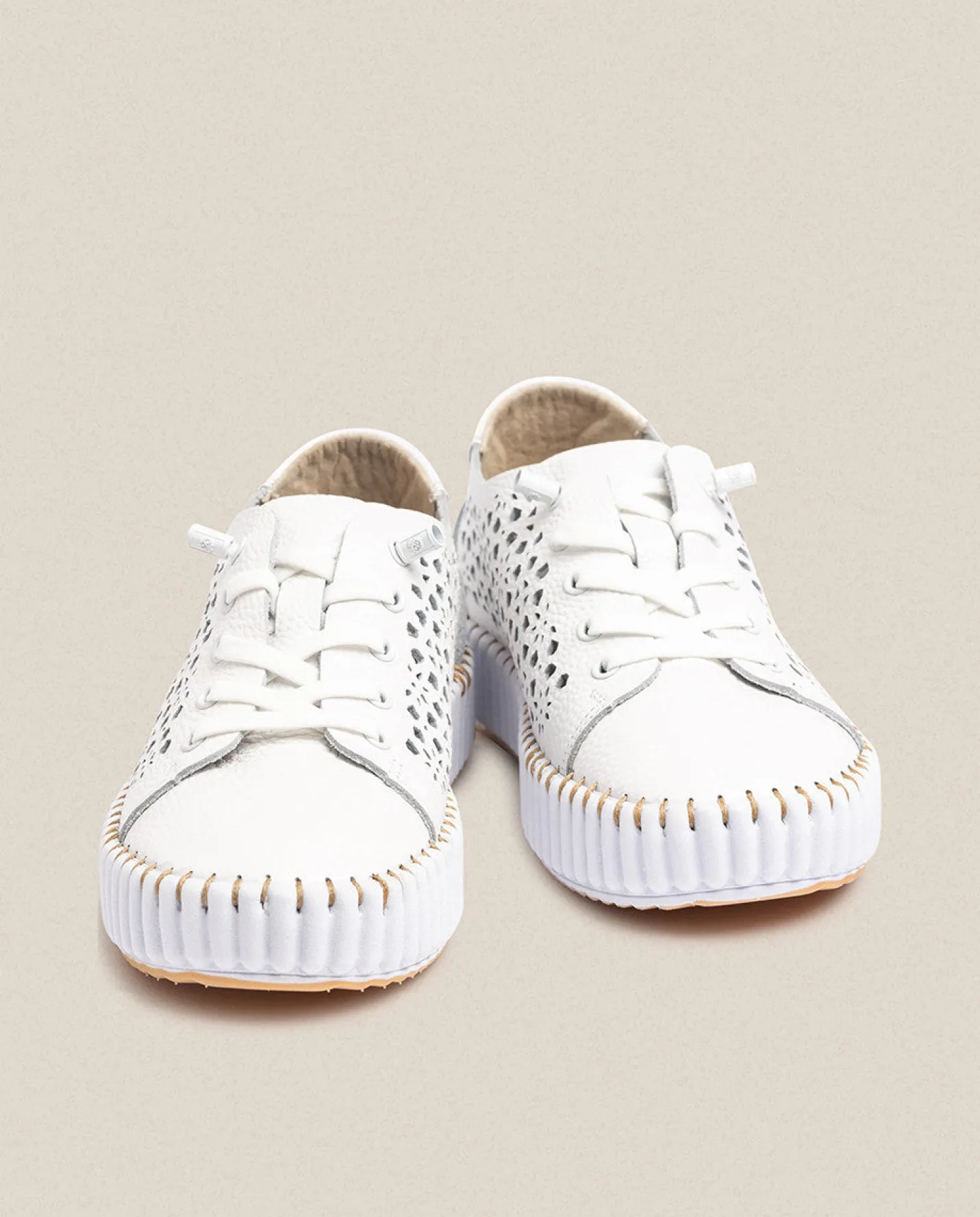 The flat shoe SINTRA 002in white stands out for its unique perforated design, adding a distinctive and elegant touch. Its elastic laces ensure a comfortable and secure fit. With a 3 cm sole, it provides additional comfort and adequate support. Ideal for a casual and sophisticated style. Made in Spain, it is crafted by hand using environmentally friendly vegetable dyes.