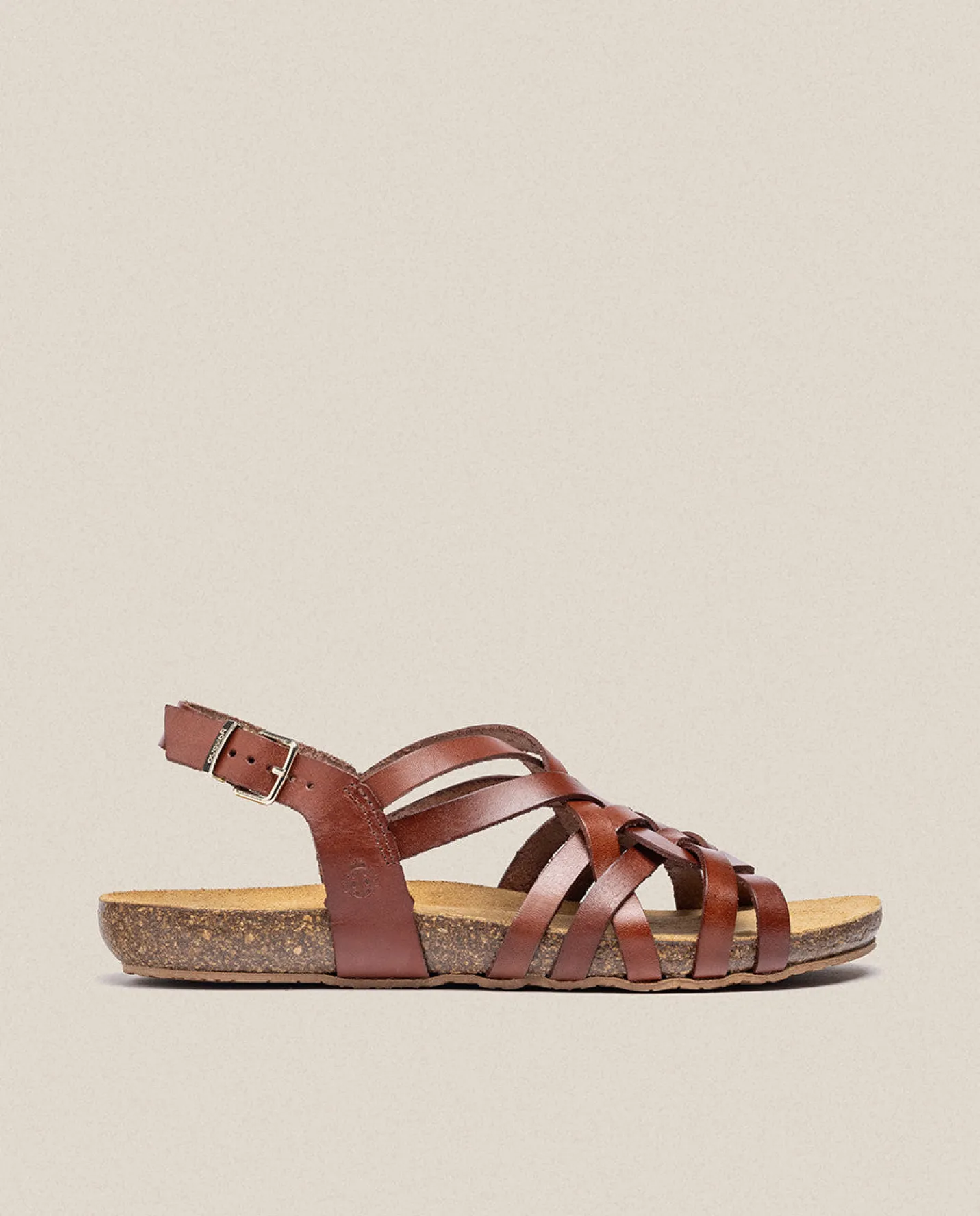 La sandalia plana IBIZA 175 en marrón, una sandalia plana compuesta por una serie de tiras multicolor y un cierre de hebilla para que se adapte con facilidad. Cuenta con una suela de 2 cm y una plantilla acolchada y antideslizante que garantiza el agarre del pie. Está elaborada de manera artesanal en España, material de piel y uso de tintes vegetales respetuosos con el medio ambiente.