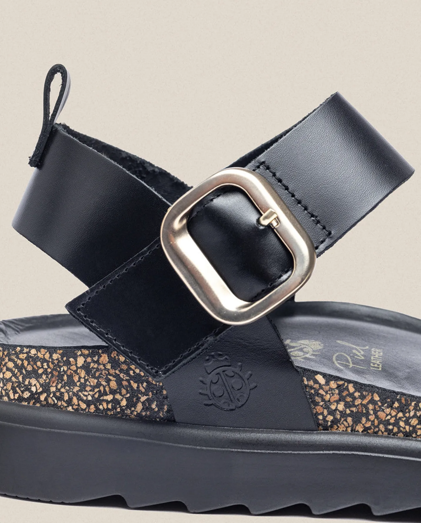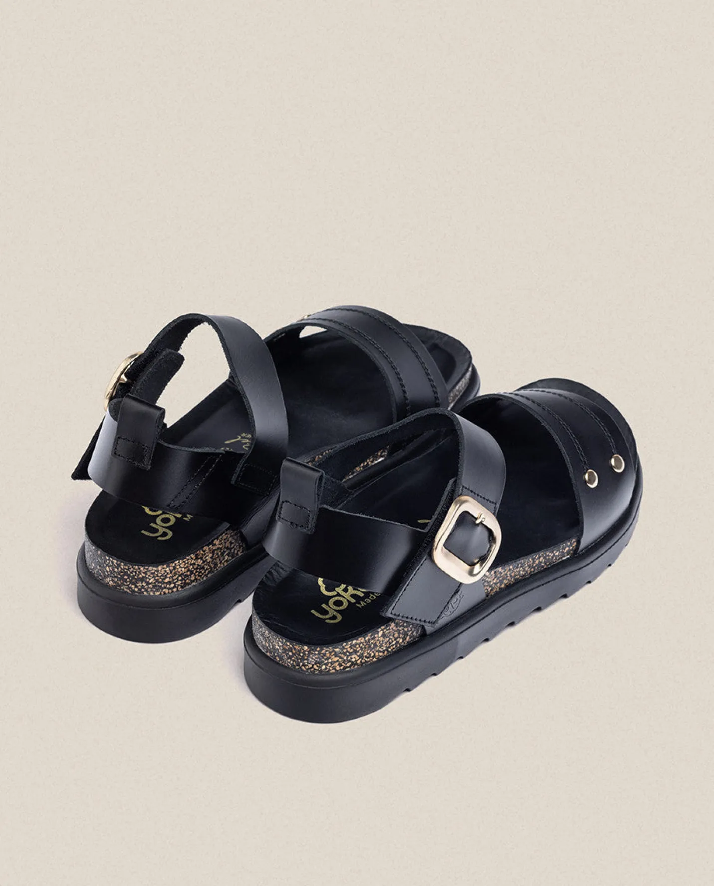 The platform sandal TUNEZ 128 in black, with gold details and a toe-grabbing strap that conveys comfort. Adjustable buckle for added comfort. Platform of 40 mm and a non-slip insole that guarantees the grip of the foot. It is handcrafted in Spain, leather material and use of environmentally friendly vegetable dyes.