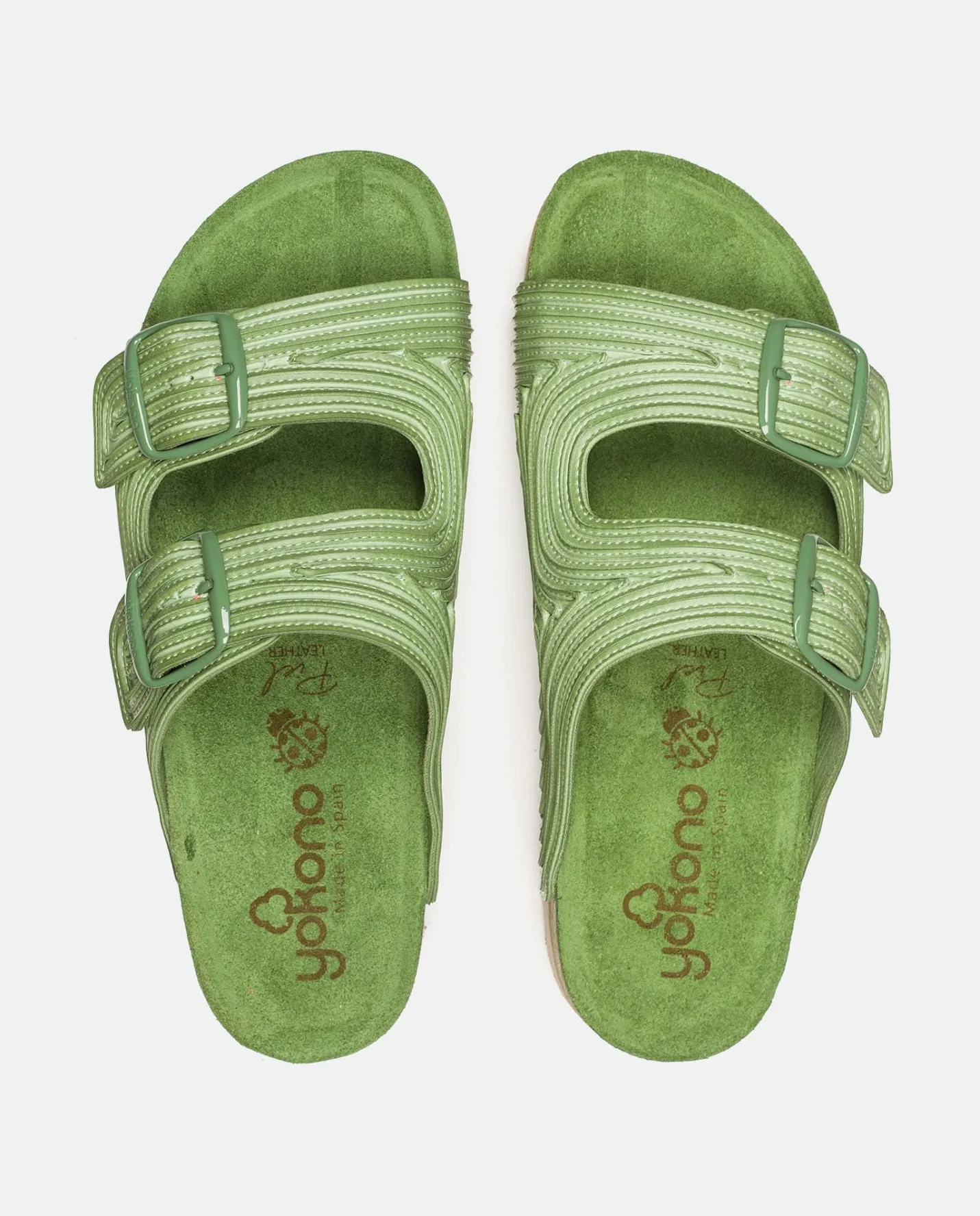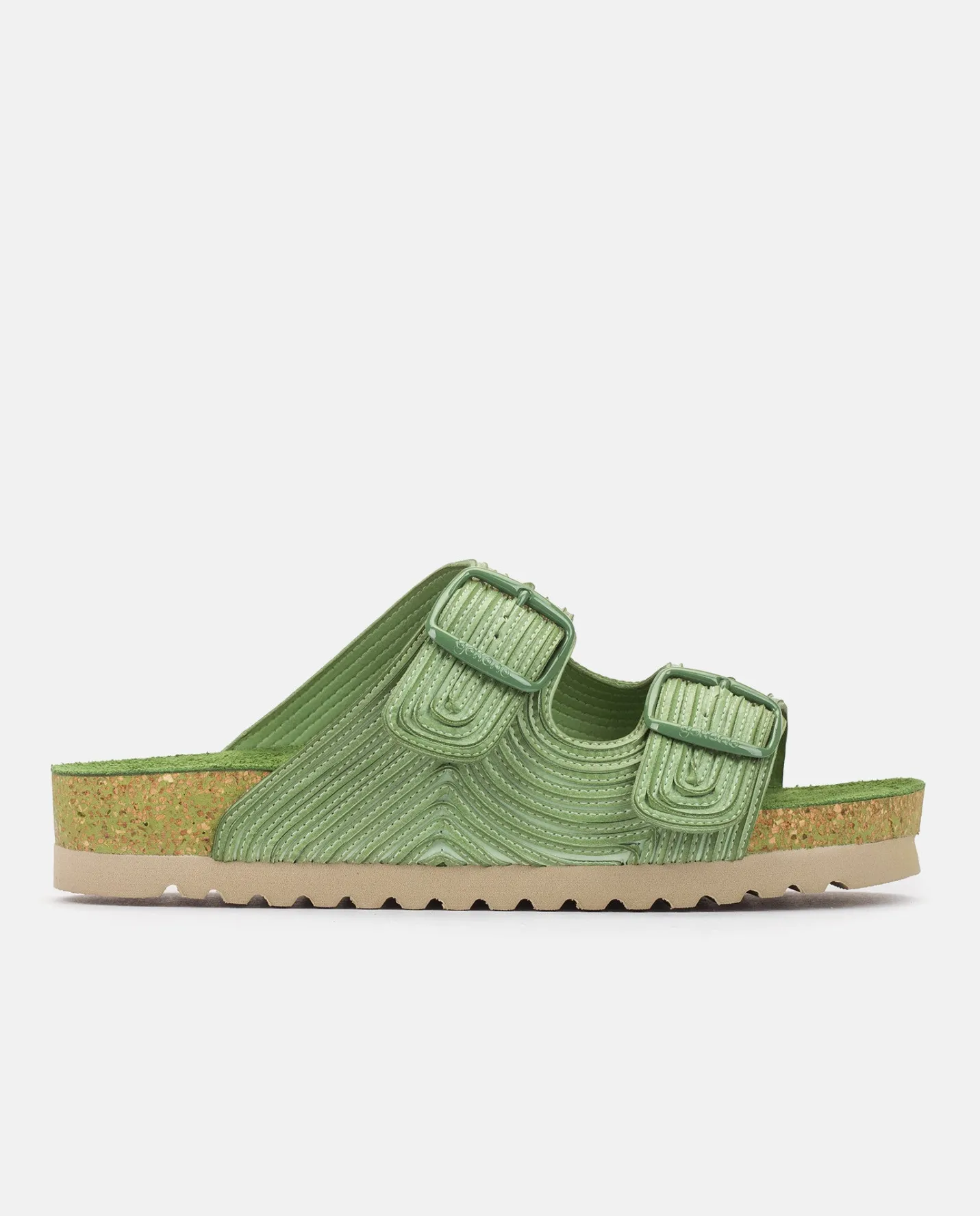 The innovative NOJA 002 green sandal, with a buckle on each of the straps that make up its striking design and a peculia…