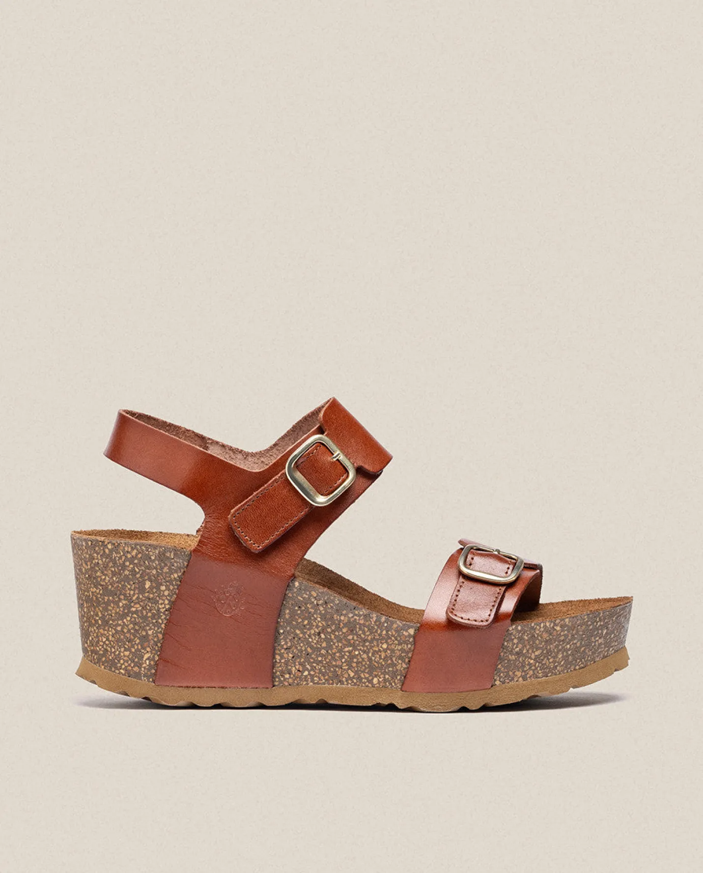 The wedge sandal BARI 301 in brown, a simple, comfortable, all-day sandal. It has two golden buckles, and a padded and non-slip insole that guarantees the grip of the foot. It has a 5.5 cm sole and is handcrafted in Spain using vegetable dyes that respect the environment.