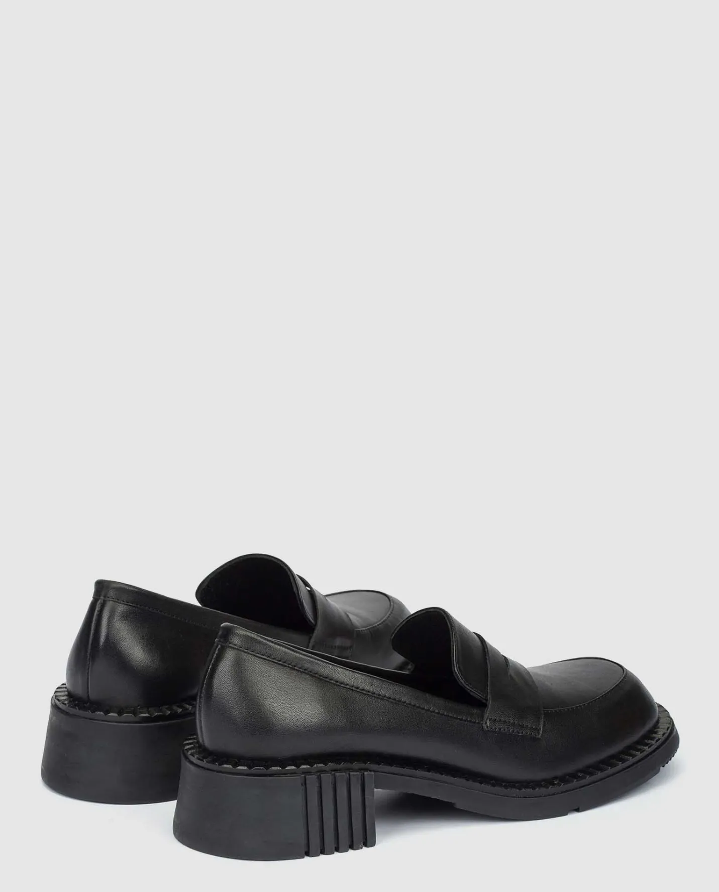Heeled bovine black leather shoe with a height of 4 centimeters. It is characterised by its original sole with 5 vertica…