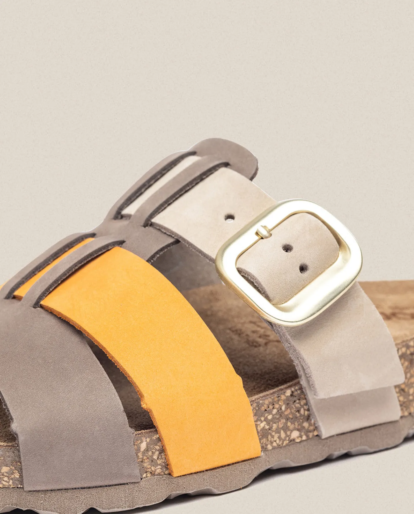 The flat sandal JERBA 137 in orange and brown, its design is composed of three straps that cover the instep and an adjustable buckle on the upper strap. It has a 3 cm sole and a non-slip insole that guarantees the grip of the foot. It is handcrafted in Spain, leather material and use of environmentally friendly vegetable dyes.