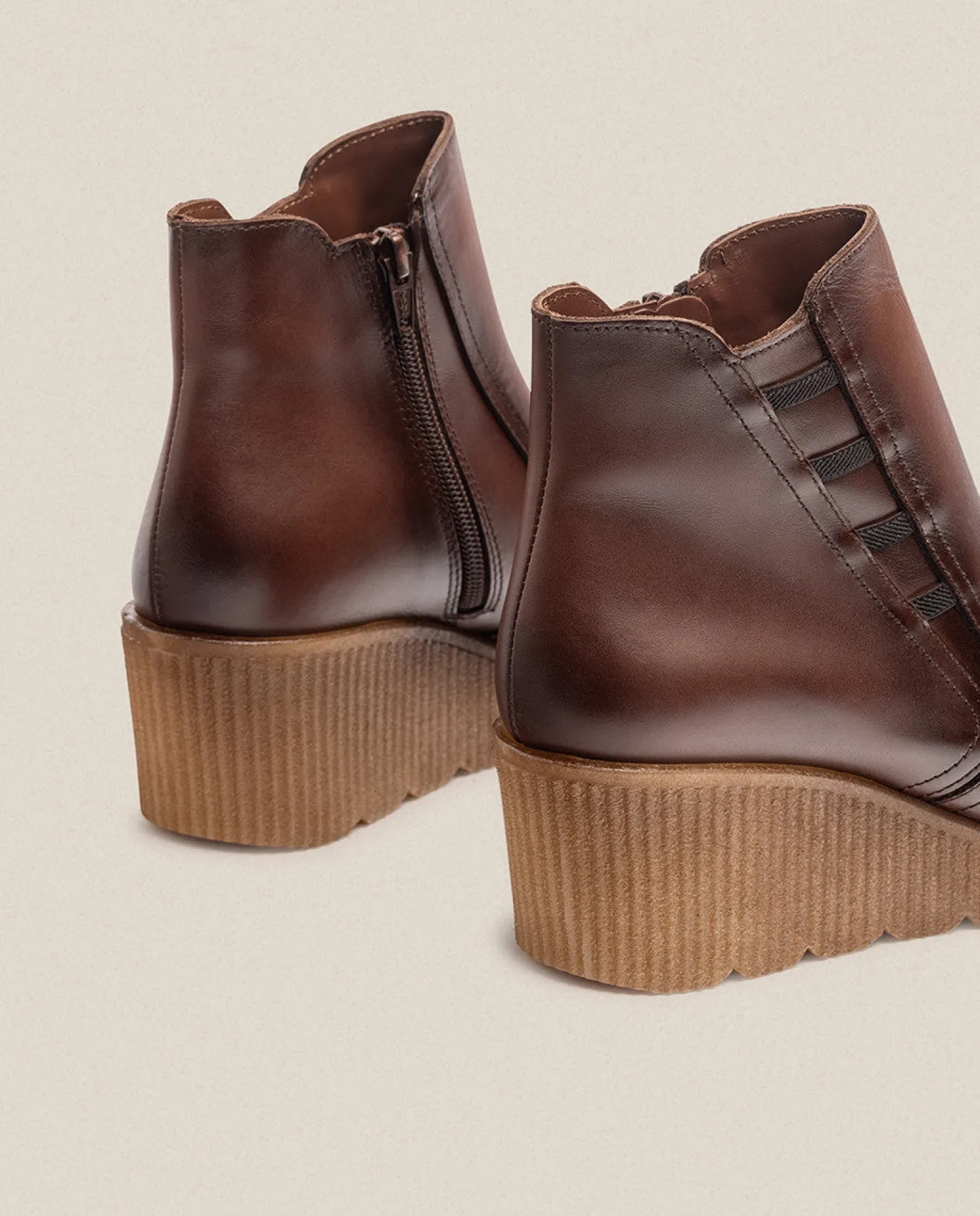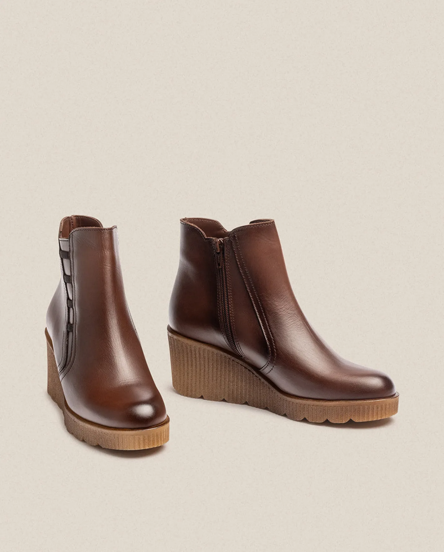 The wedge ankle boot MADONA 006 in brown, featuring a 6 cm sole and a zipper closure, ensures maximum foot comfort for daily wear. Additionally, the elastic details on the outer side add a distinctive touch to its minimalist design. It includes a cushioned and non-slip insole, is made from leather, and is handcrafted in Spain using natural vegetable dyes.