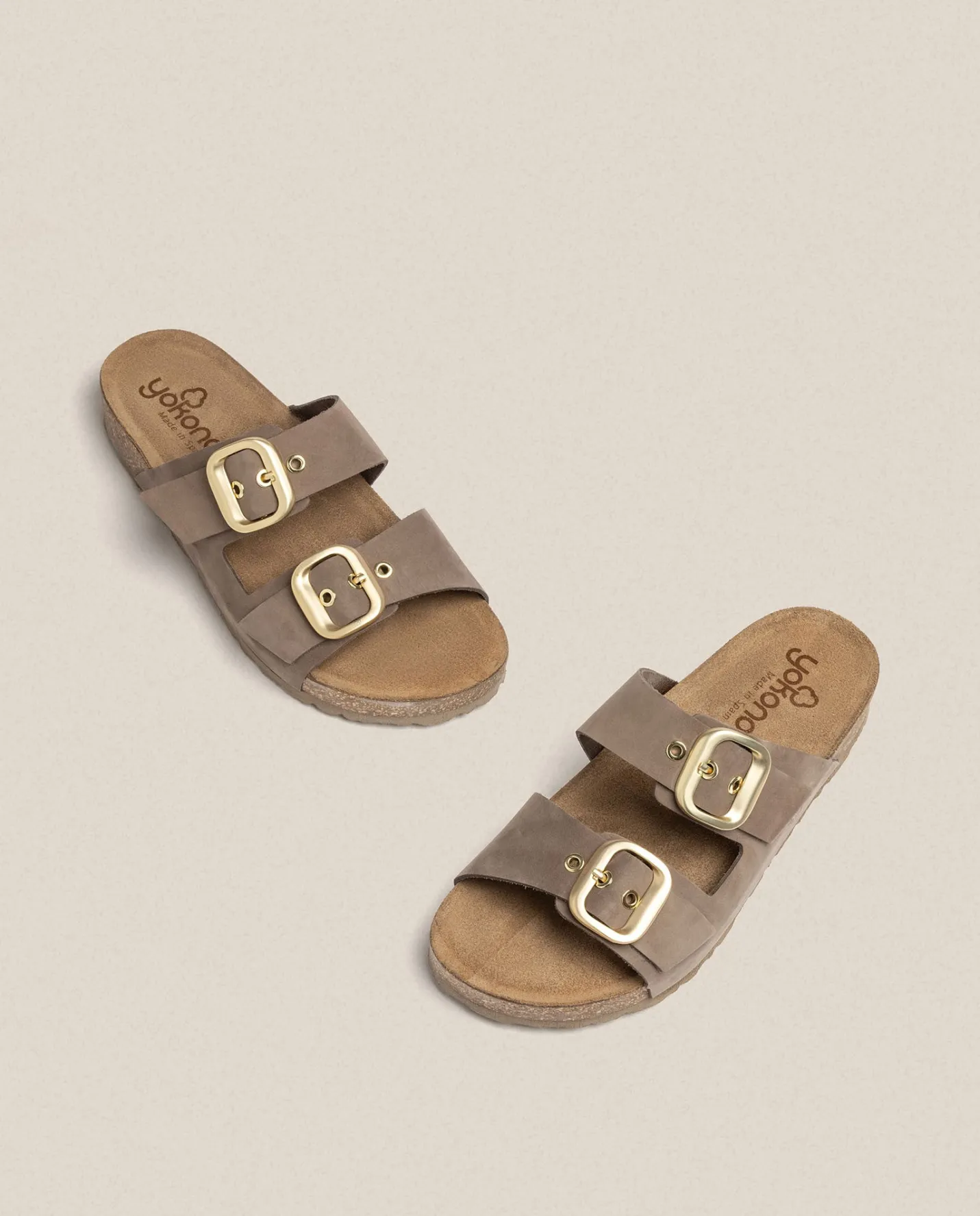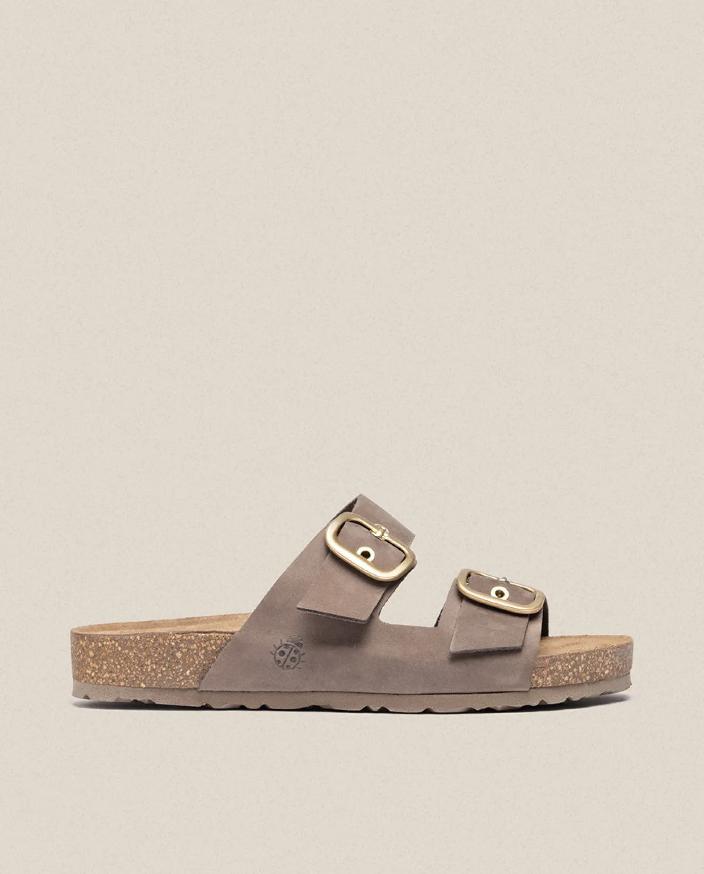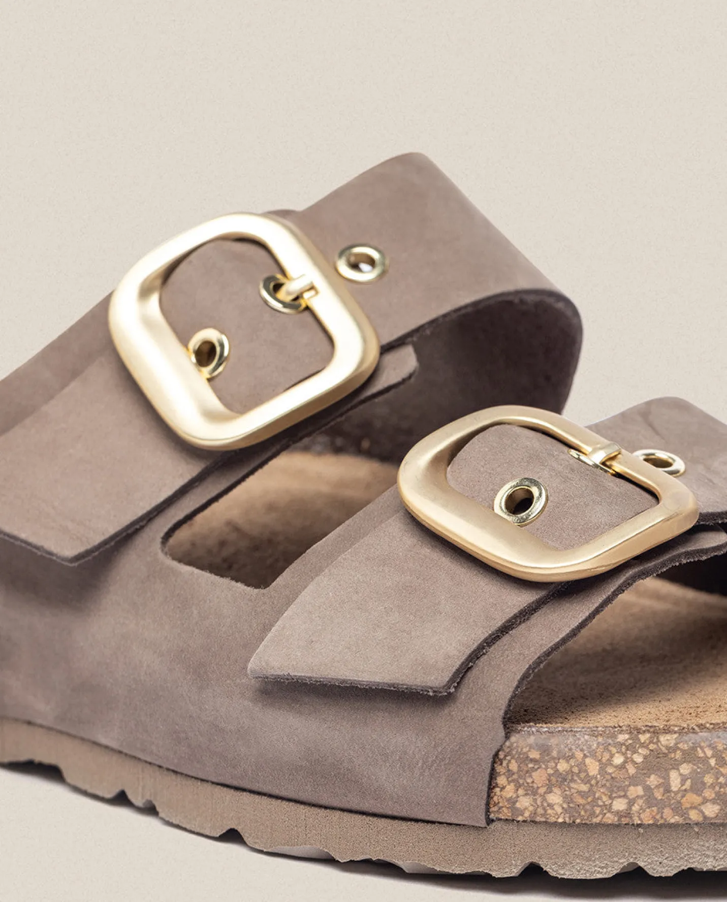 La sandalia plana JERBA 136 en marrón, con dos tiras que cubren el empeine y dos hebillas doradas para que se ajuste con facilidad. Cuenta con una suela de 3 cm y una plantilla antideslizante que garantiza el agarre del pie. Está elaborada de manera artesanal en España, material de piel y uso de tintes vegetales respetuosos con el medio ambiente.