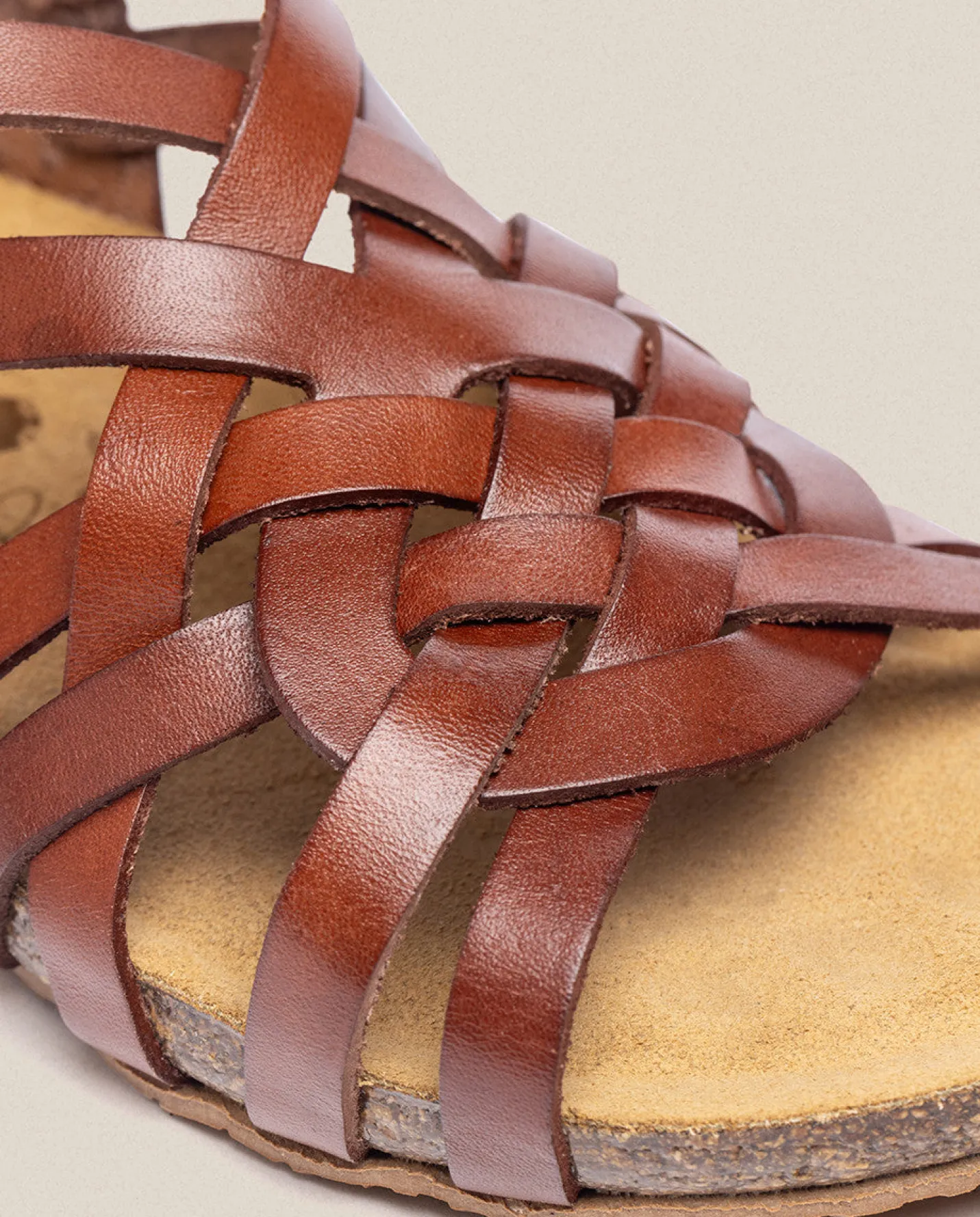 La sandalia plana IBIZA 175 en marrón, una sandalia plana compuesta por una serie de tiras multicolor y un cierre de hebilla para que se adapte con facilidad. Cuenta con una suela de 2 cm y una plantilla acolchada y antideslizante que garantiza el agarre del pie. Está elaborada de manera artesanal en España, material de piel y uso de tintes vegetales respetuosos con el medio ambiente.