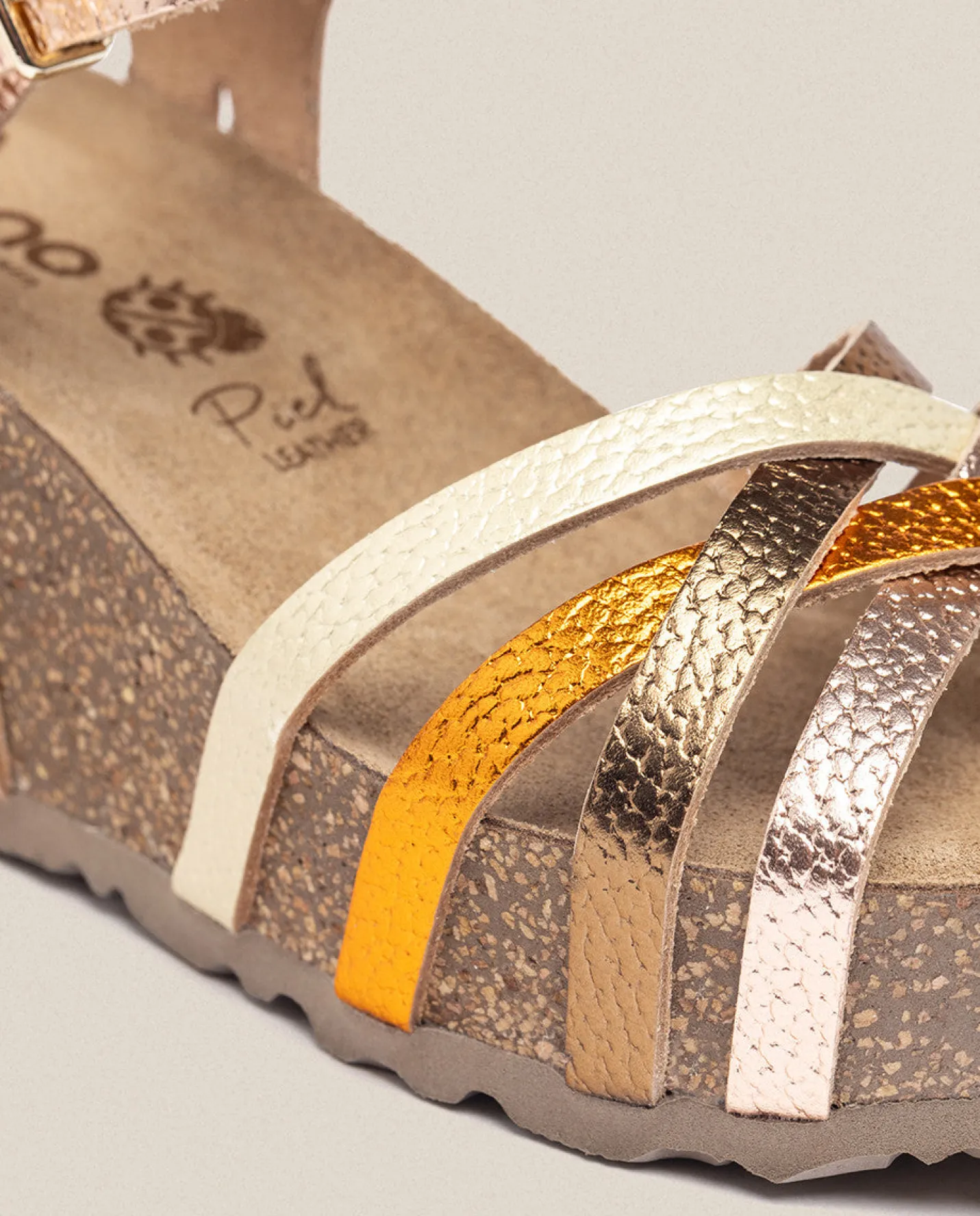 The wedge sandal BARI 302 in pink, composed of a series of multicolored straps that hold the toes and a buckle closure that facilitates the fit. It has a 5.5 cm sole and a cushioned, non-slip insole that guarantees the foot’s grip. It is handcrafted in Spain using environmentally friendly vegetable dyes.